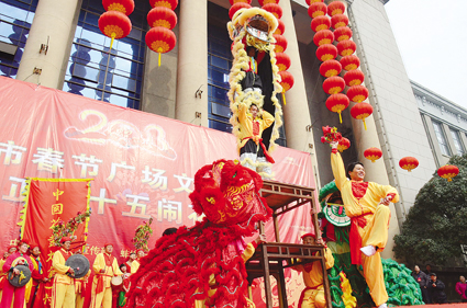 作為2013年蚌埠市春節(jié)廣場(chǎng)文化活動(dòng)的壓軸大戲,整場(chǎng)演出共有來(lái)自禹會(huì)區(qū)文化館、蚌山區(qū)文化館和龍子湖區(qū)文化館的8支花鼓燈表演隊(duì)先后登臺(tái)獻(xiàn)藝,一個(gè)小時(shí)的演出吸引了上千名市民駐足觀看。據(jù)市文廣新局負(fù)責(zé)人介紹,這8支花鼓燈隊(duì)伍從全市一百多支花鼓燈藝術(shù)團(tuán)中脫穎而出,聚集在科學(xué)宮廣場(chǎng)上表演,為市民送上元宵節(jié)藝術(shù)大餐。